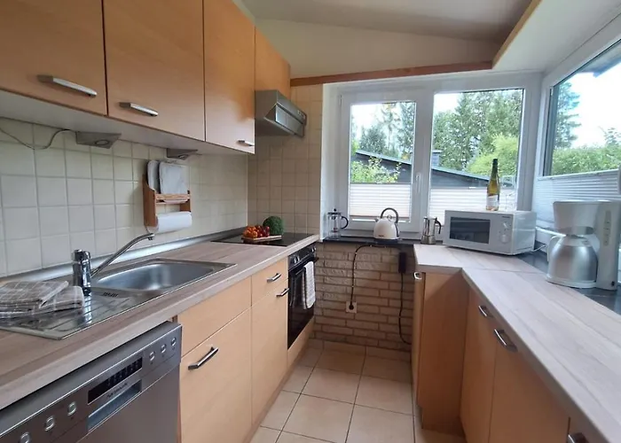 La Ferienhaus "Waldlust" - Waldrandlage - Haustierfreundlich cuenta con una cocina bien equipada, un hervidor eléctrico, una nevera y un horno.