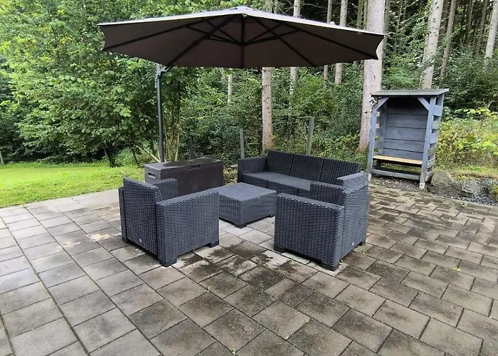 Situada a 4 km de Rother Kopf, la Ferienhaus "Waldlust" - Waldrandlage - Haustierfreundlich Gerolstein ofrece una terraza con vistas al jardín.